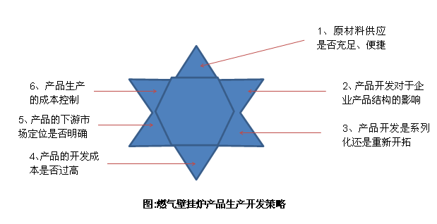 在產(chǎn)品生產(chǎn)和開發(fā)中,企業(yè)應考慮的問題很多。我們建議壁掛爐企業(yè)從戰(zhàn)略角度出發(fā),先確定主營產(chǎn)品和主營業(yè)務,再針對性的配置產(chǎn)品和開發(fā)新產(chǎn)品。尤其是開發(fā)新產(chǎn)品,壁掛爐企業(yè)一定要對其合理定位,不能追求短期的效益而影響企業(yè)主營業(yè)務的地位。面對目前國內(nèi)還不成熟的壁掛爐市場,企業(yè)只有先做專、做強,最后才能做大。雖然多元經(jīng)營的誘惑很大,但是企業(yè)應避免產(chǎn)品多而不強的現(xiàn)象發(fā)生。下圖為壁掛爐企業(yè)在產(chǎn)品開發(fā)時,提供了六個方面的思考和測評,將會大大提高產(chǎn)品開發(fā)的成功率。